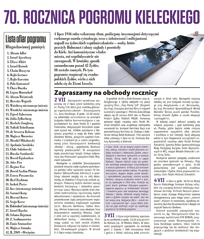 24 czerwca w „Echu Dnia” ukazała się wkładka poświęcona obchodom 70. rocznicy pogromu kieleckiego organizowanym przez Stowarzyszenie im. Jana Karskiego