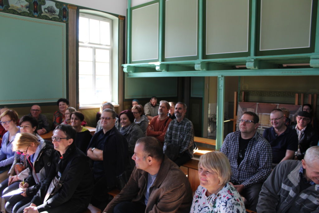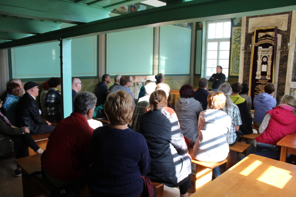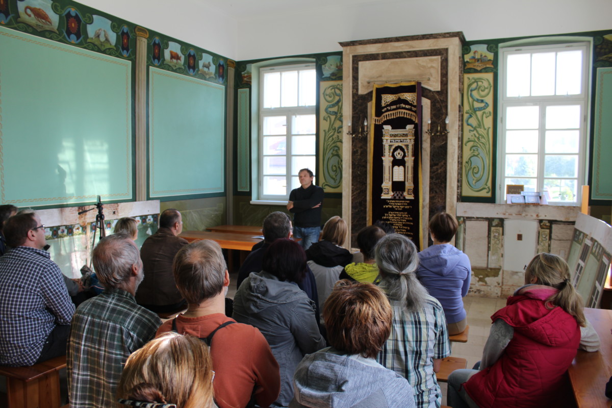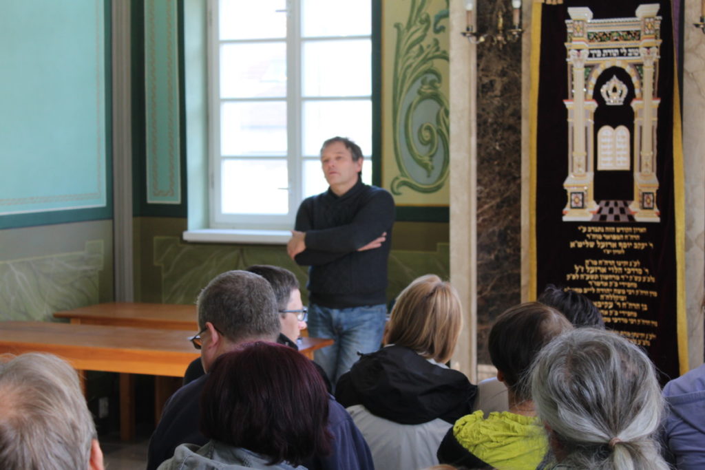 Zwiedzaniem domu modlitwy rodziny Zagajskich rozpoczęliśmy w tę niedzielę kolejny sezon naszego studium „Abc judaizmu i kultury żydowskiej”. Nasz gość, p. Krzysztof Myśliński, historyk sztuki, kierownik działu edukacji i promocji Muzeum Historii Kielc, opowiadał o historii i wystroju domu modlitwy, o unikalności tego obiektu, oraz o kontrowersjach związanych z przeniesieniem modlitewni z jej pierwotnego miejsca: podwórka kamienicy przy ulicy Słowackiego na teren przy cmentarzu żydowskim na kieleckim Pakoszu.