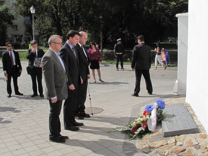 Ambasador, konusl oraz Bogdan Białek złożyli wieniec pod tablicą ze słowami modlitwy Jana Pawła II upamiętniającej tamto tragiczne wydarzenie (na fasadzie budynku znajdują się jeszcze dwie inne inskrypcje dedykowane ofiarom zajść sprzed 65 lat).