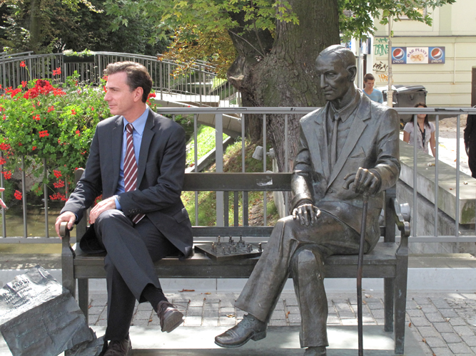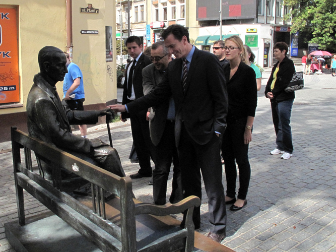 Mimo że plan pobytu ambasadora w Kielcach nie przewidywał „odwiedzin” Jana Karskiego, dyplomata ochoczo przystał na zaproszenie Bogdana Białka, by pomaszerować ku wykonanej z brązu figurze bohaterskiego kuriera znajdującej się przy kieleckim deptaku. Tam, z wyraźną sympatią Lee Feinstein wysłuchał opowieści prezesa o okolicznościach powstania „ławeczki”, której fundacja w 2005 roku była pierwszym znaczącym przedsięwzięciem zrealizowanym przez Stowarzyszenie.
