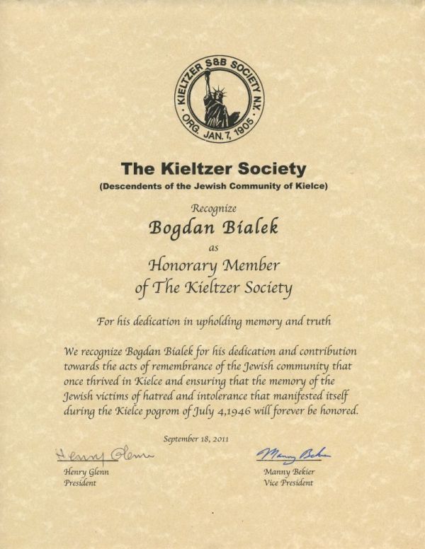 Za oddanie i poświęcenie w podtrzymywaniu pamięci i prawdy oraz w uznaniu zasług i poświęcenia Pana Bogdana Białka na rzecz zachowania pamięci o społeczności żydowskiej, która niegdyś żyła w Kielcach a także pamięci Żydów – ofiar nienawiści i nietolerancji, której manifestacją stał się Pogrom 4 lipca 1946 roku.