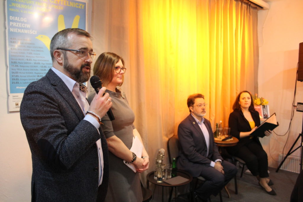 Naszym gościem był dr Michał Rusinek – literaturoznawca, tłumacz, pisarz, który przez 6 lat pełnił rolę sekretarza Wisławy Szymborskiej, a obecnie kieruje fundacją opiekującej się jej spuścizną. Nasz gość opowiadał o początkach swojej współpracy z poetką, oraz o codzienności ich codziennego funkcjonowania. Wracając do jej wiersza „Nienawiść”, pokazywał, jak obrany przez noblistkę stosunek do rzeczywistości pozwalał na pielęgnowanie szacunku wobec każdego człowieka. Spotkanie przeplatane było czytaniem wierszy Szymborskiej przez Magdalenę Smalarę, aktorkę Teatru Polskiego w Warszawie.