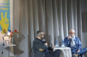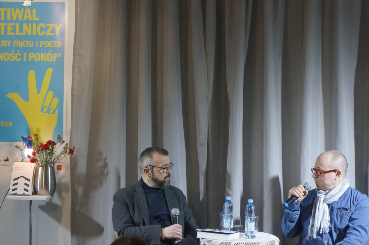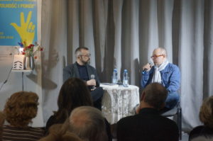 – Pretekstem do rozmowy jest książka „Księga Wyjścia”. Ale będziemy rozmawiać nie tylko o książce – będziemy rozmawiać o sprawach, które są jakby podglebiem tej książki, są wokół niej – mówił na początku prowadzący spotkanie Bogdan Białek, pytając jednocześnie o znaczenia tytułu, przywodzącego na myśl biblijną Księgę Wyjścia. – To wszystko nie jest jednoznaczne, bo ta historia nie jest po prostu czarna, tam jest dużo odcieni szarości, które niuansują, nie leczą nas z tej szarości, ale mnie w każdym razie otworzyły oczy na bardzo wiele rzeczy – odpowiadał Mikołaj Grynberg – Kiedy skończyłem pisać książkę „Oskarżam Auschwitz”, jest to książka z rozmowami z ludźmi wychowanymi przez ocalałych z Holokaustu, to pomyślałem, że tak naprawdę został mi jeszcze jeden temat. I to jest temat z mojej listy domowej, z mojego domu rodzinnego, w moim domu był to rok ’68. I pomyślałem, że jest to dla naturalny kolejny mój temat.