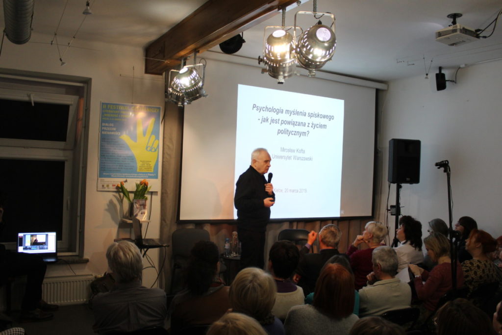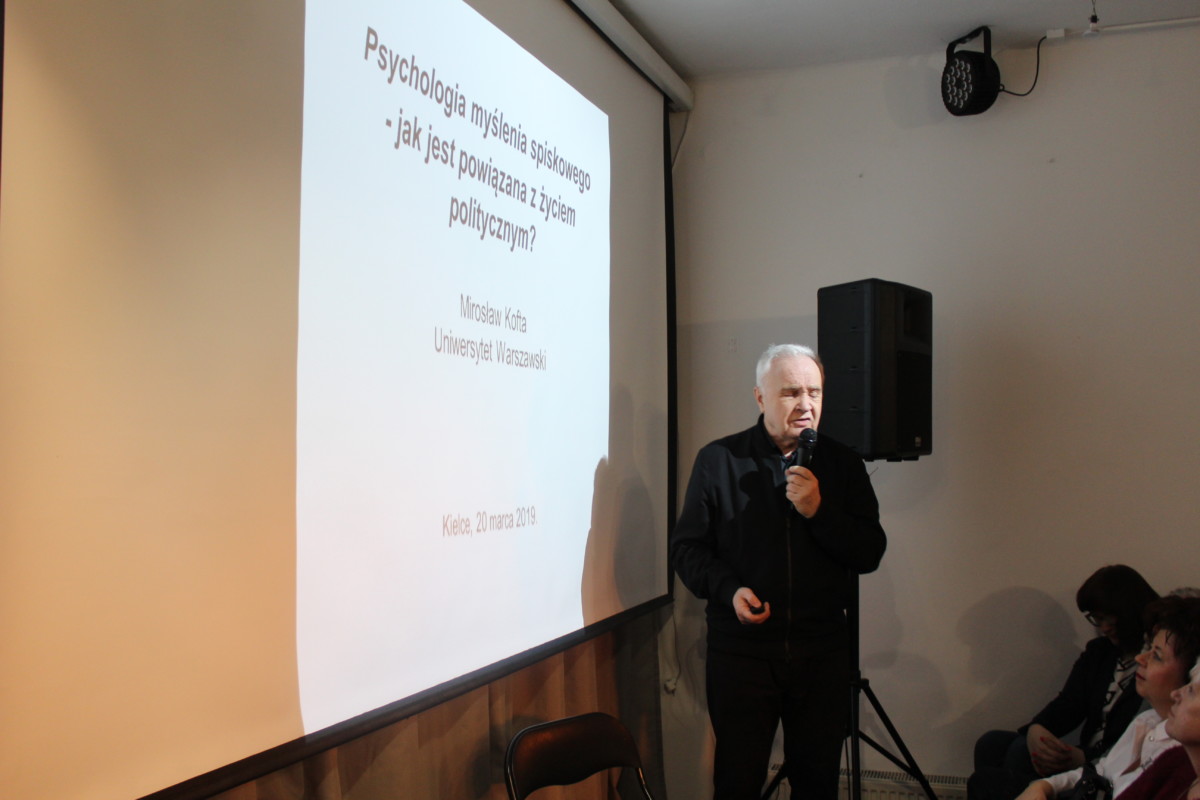 Prof. Mirosław Kofta – psycholog, pracownik naukowy Wydziału Psychologii Uniwersytetu Warszawskiego i Szkoły Wyższej Psychologii Społecznej, członek Rady Naukowej Instytutu Psychologii PAN, mówił o zjawisku myślenia spiskowego oraz o jego wykorzystywaniu w polskiej polityce. Rozmowę poprowadziła dr Dorota Krzemionka, redaktor naczelna czasopisma psychologicznego „Charaktery”.