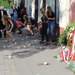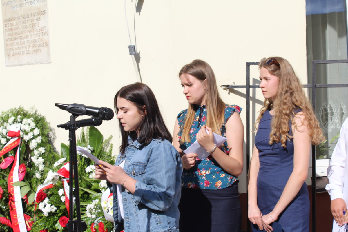 Następnie uczestnicy obchodów przeszli przed kamienicę przy Planty 7, gdzie odbyła się część uroczystości prowadzona przez kielecką młodzież. W czterech językach: po polsku, po hebrajsku, w jidisz i po angielsko odczytano treść krótkiej informacji o tragedii z 4 lipca 1946 roku, którą umieszczono na grobie ofiar. Następnie młodzi ludzie odczytali listę ofiar i zapalili znicze przy poświęconych konkretnym osobom tabliczkach umieszczonych w chodniku przy kamienicy. Uczestnicy uroczystości poznali także treść listu, który na kilka dni przed obchodami otrzymał Bogdan Białek. Starsza kobieta opowiada w nim historię swojego teścia, który jako chłopiec został ocalony z pogromu przez milicjanta, który wyprowadził go z tłumu, udając, że idzie go zabić. – Ten mail pokazuje, że pogrom to nie jest historia, która