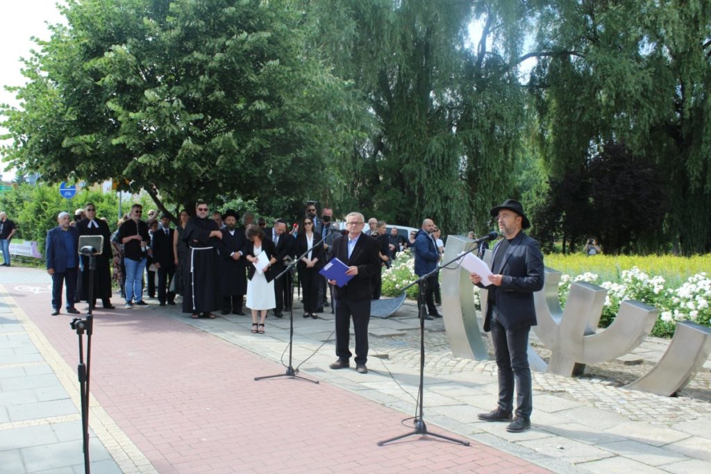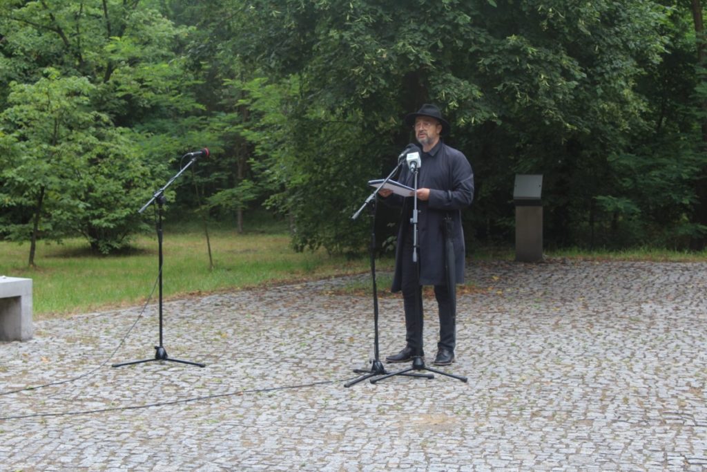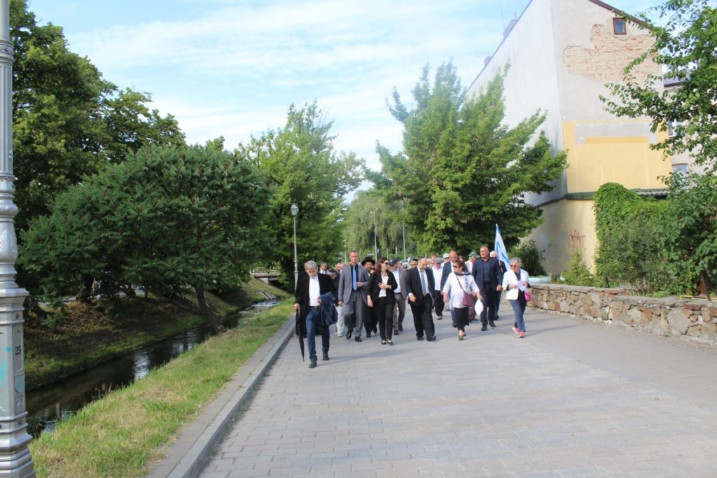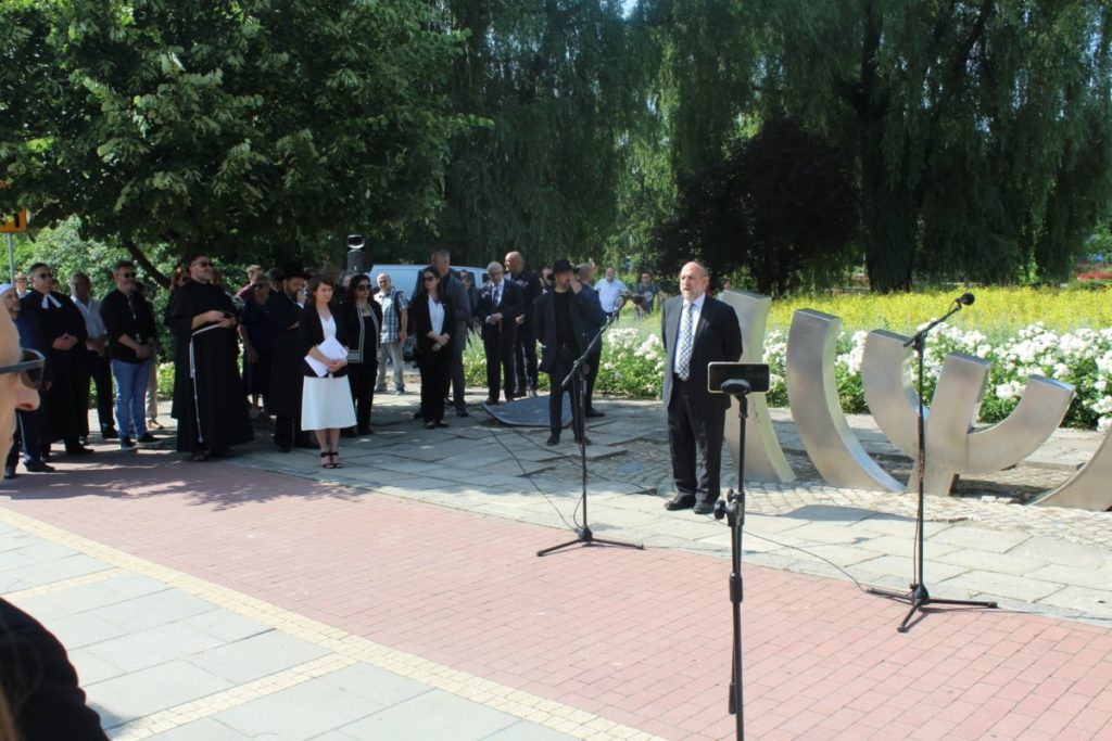Marsz Pamięci rozpoczął się przy pomniku Menora, który poświęcony jest Żydom z kieleckiego getta zamordowanym w obozie zagłady w Treblince w 1942 roku. Organizator uroczystości Bogdan Białek powiedział mi.in.” Oprócz wszystkich słów, które tego dnia i w tym miejscu możemy skierować do Was Żydzi, oprócz słów żalu, wstydu i skruchy, niech wybrzmi także to jedno słowo do dzisiaj nie wypowiedziane: dziękuję. Dziękuję za to, że byliście, że jesteście. I chcę wyrazić pragnienie i życzenie: obyście byli” Następnie głos zabrali Bogdan Wenta – Prezydent Kielc i Avi Borenstein – dyrektor i założyciel Jews of Ostrowiec Memorial Project, przedstawiciel Żydów kieleckich z Izraela i Nowego Jorku.