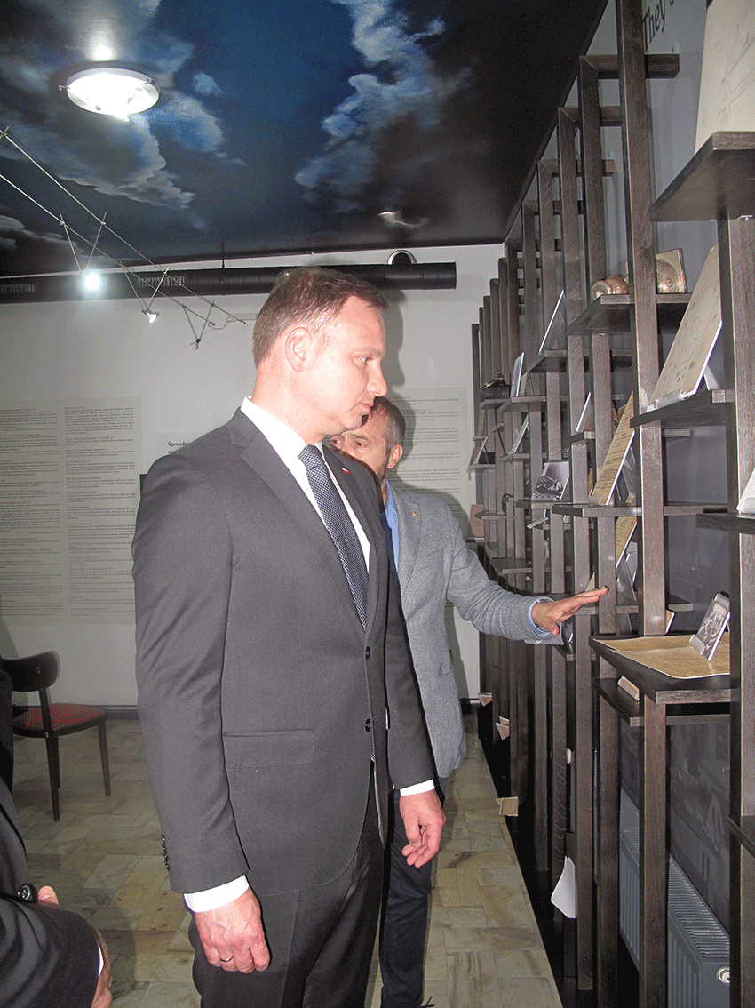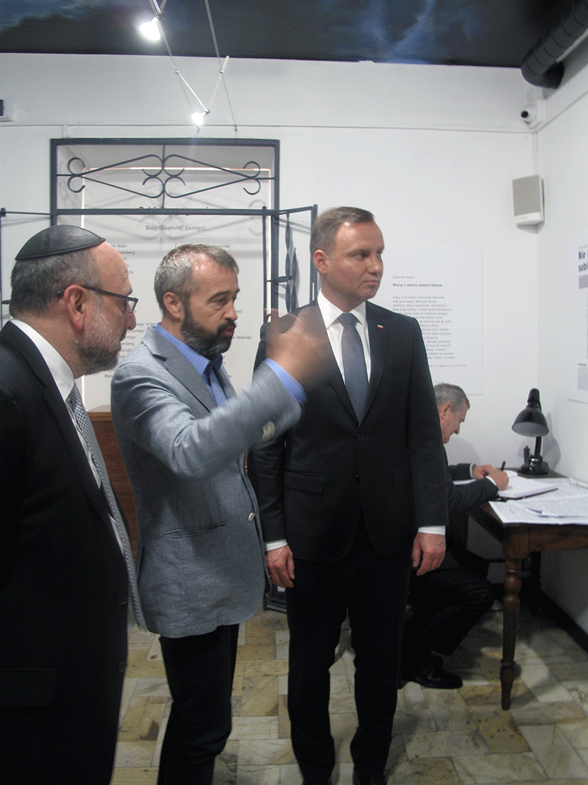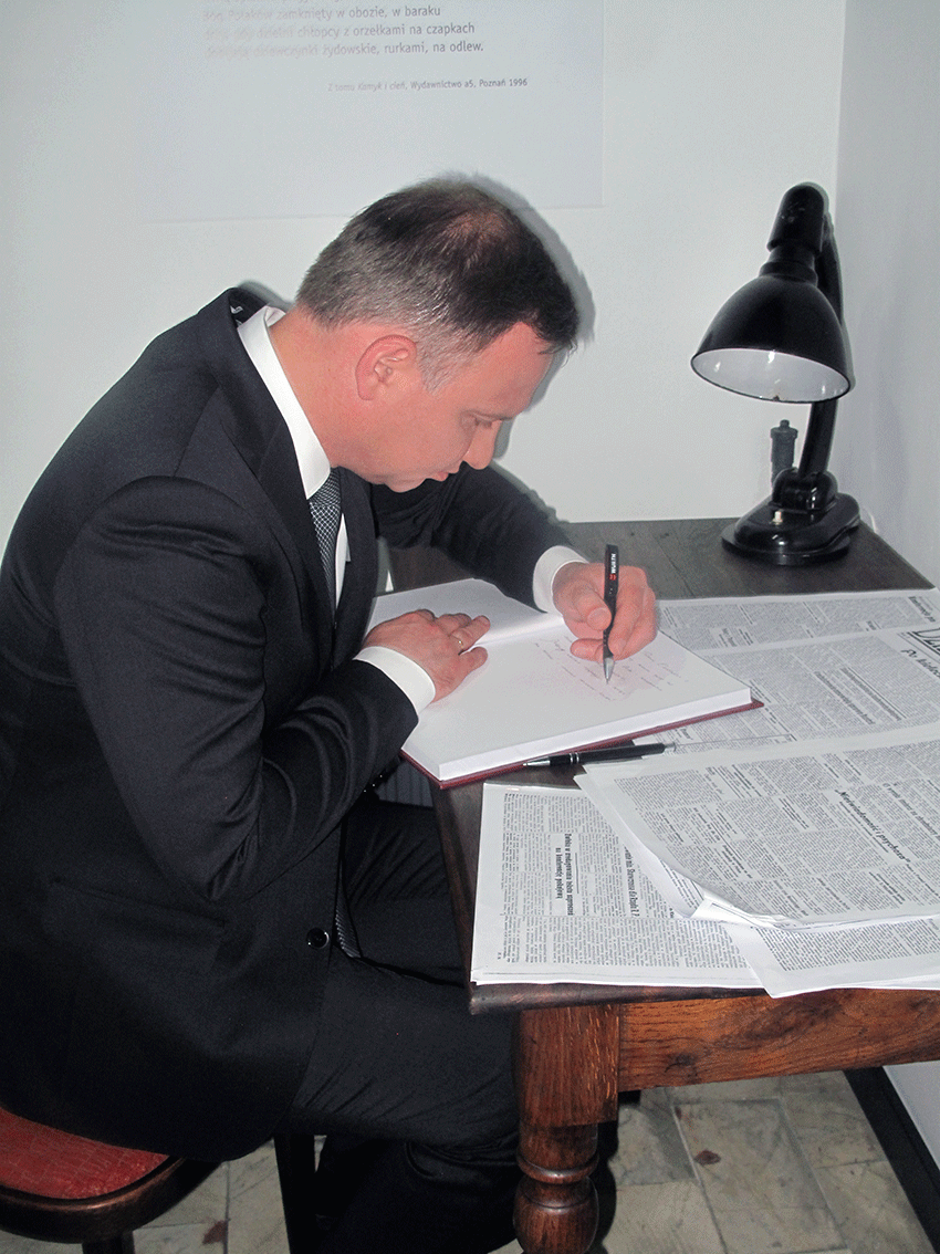 (Na zdjęciu od lewej: Naczelny Rabin Polski Michael Schudrich, prezes Stowarzyszenia im. Jana Karskiego Bogdan Białek, Prezydent RP Andrzej Duda, wicepremier oraz minister kultury i dziedzictwa narodowego Piotr Gliński, który wpisuje się do księgi pamiątkowej)