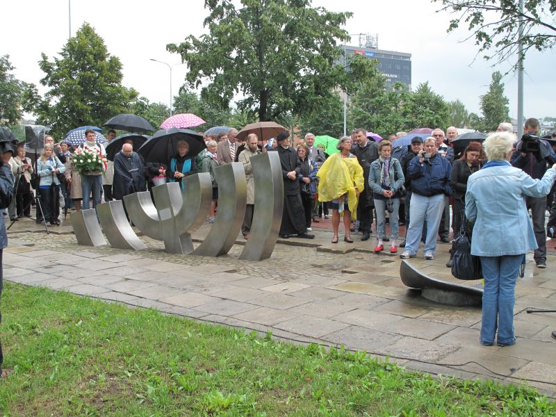 Obchody rozpoczęły się przed pomnikiem Menora. Prezes Stowarzyszenia Bogdan Białek zwrócił się do zgromadzonych: – Menora, przed którą stoimy, upamiętnia żydowskich mieszkańców naszego miasta, ich trwałą w nim obecność oraz męczeńską śmierć zadaną im przez Niemców. Stoimy w miejscu, w którym było kieleckie getto. Miejsce, w którym zgromadzono żydowskich mieszkańców Kielc, a także okolicznych miasteczek. Stłoczono ich, pozbawiono – najpierw elementarnych warunków egzystencji, a potem godności i nadziei. W ostatecznym momencie pozbawiono ich życia.