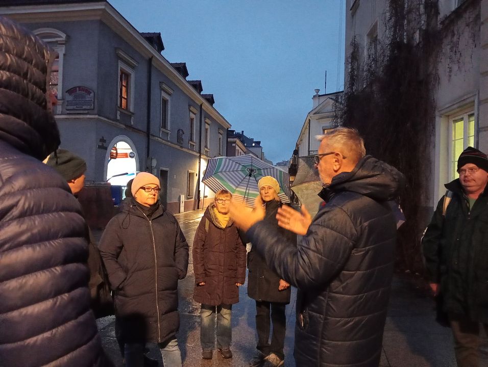 Mimo kapryśnej deszczowej aury, uczestnicy spaceru edukacyjnego w piątkowy wieczór (17 listopada) udowodnili swoją niezłomną determinację. Pod przewodnictwem pana dr. Marka Maciągowskiego wyruszyliśmy w podróż po historycznych śladach kieleckich Żydów.