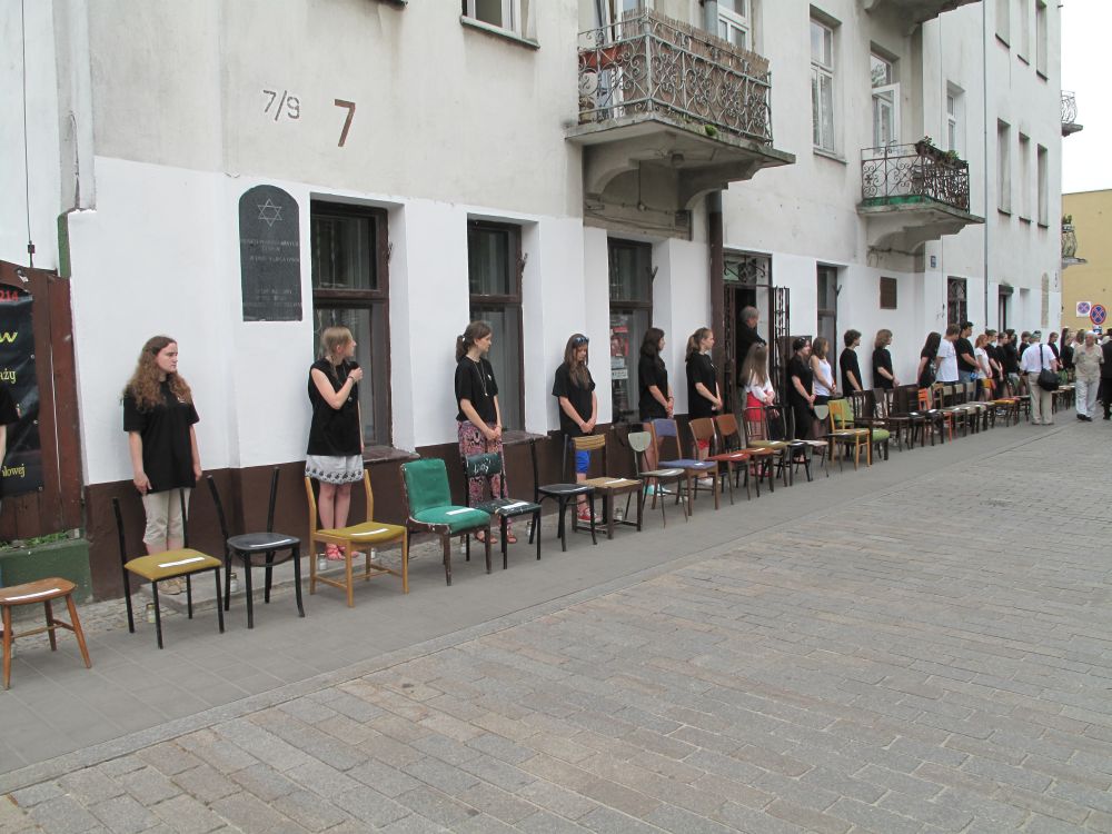 Kolejnym punktem na trasie Marszu była modlitwa pod kamienicą przy ulicy Planty 9. To właśnie w tym miejscu przed 66-laty doszło do okrutnej zbrodni popełnionej na Żydach. Wzdłuż całego gmachu od strony ulicy ustawione zostały 42 krzesła z nazwiskami pomordowanych w 1946 roku osób. Przy krzesłach stali uczniowe z VI Liceum Ogólnokształcącego im. Juliusza Słowackiego w Kielcach, zaś jedna z uczennic zwróciła się do zebranych wyjaśniając – dlaczego dziś, młodzi ludzie powinni pamiętać o tragicznych wydarzeniach z odległej historii.