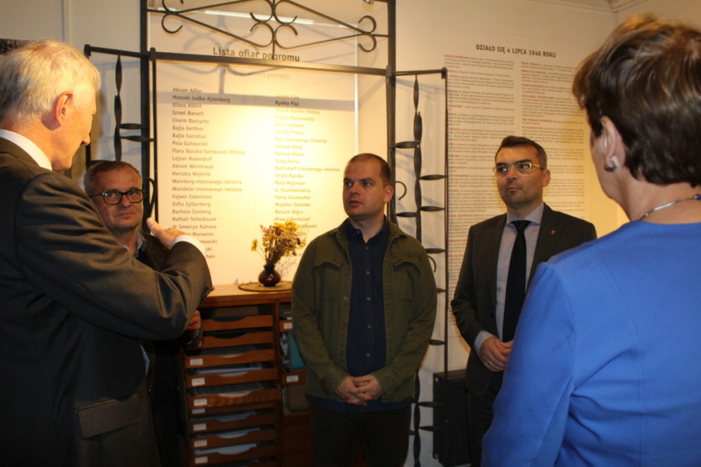 Ambasador Królestwa Niderlandów w Polsce Pani Daphne Bergsma, wraz z osobami towarzyszącymi, odwiedziła Instytut Kultury Spotkania i Dialogu w Kielcach Stowarzyszenia im. Jana Karskiego. „To wielki zaszczyt być w tak ważnym miejscu pamięci” – powiedziała wzruszona pani ambasador. Andrzej Białek, wiceprezes Stowarzyszenia, oprowadził gości po wystawach stałych, dotyczących pogromów z lat 1918 i 1946. Opowiedział o kieleckiej drodze do pojednania i przywracania pamięci o trudnej historii naszego miasta. Ogromne wrażenie na gościach zrobił także Pokój Błogosławieństw, w którym mówimy, że odpowiedzią na zło jest błogosławienie, a nie złorzeczenie.