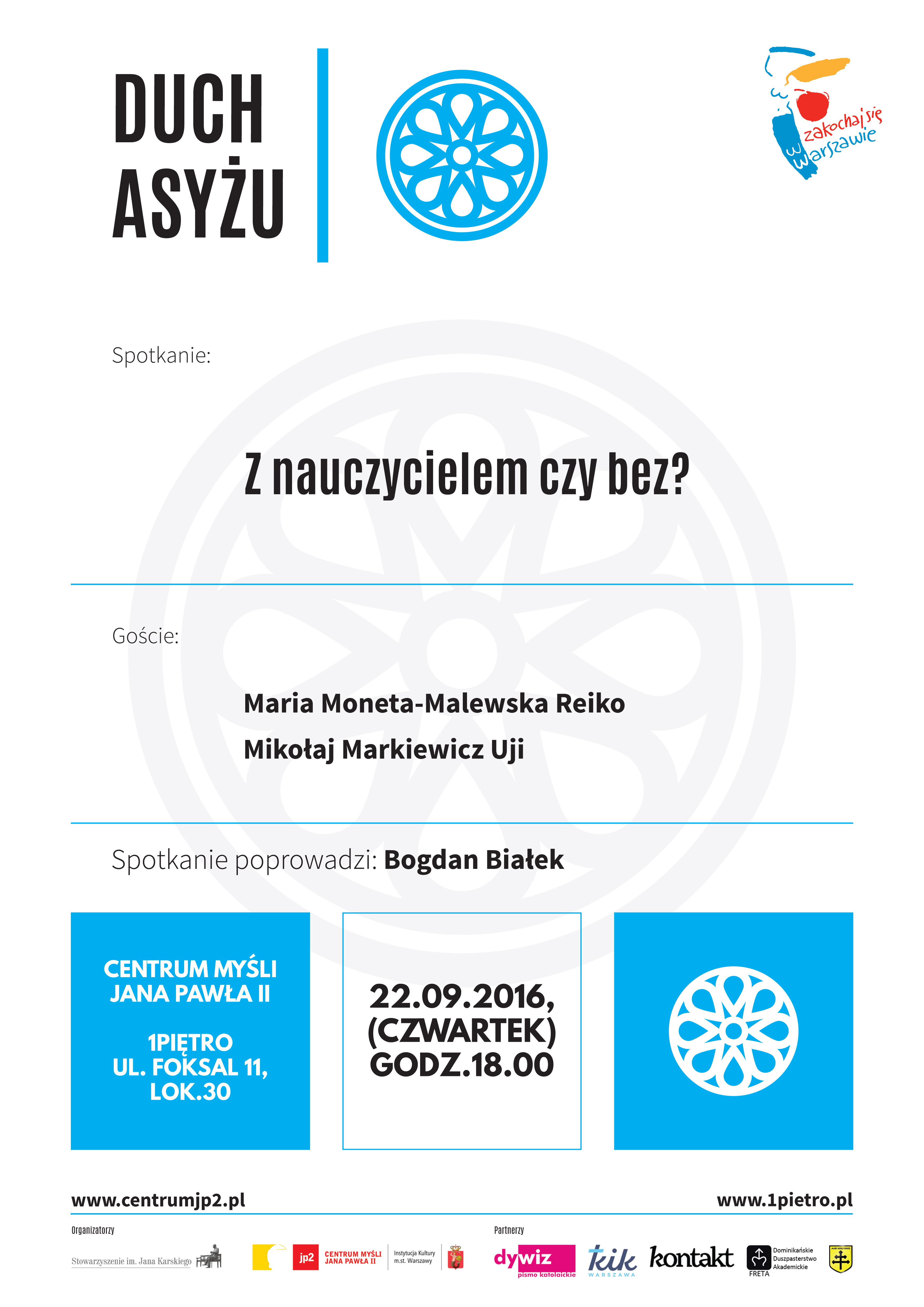 Stowarzyszenie im. Jana Karskiego oraz Centrum Myśli Jana Pawła II zapraszają na spotkanie międzyreligijne pt. „Z nauczycielem, czy bez?”. Doświadczeni nauczyciele buddyjscy – Maria Moneta-Malewska Reiko i Mikołaj Markiewicz Uji rozmawiać będą o roli i potrzebie nauczyciela/przewodnika na drodze rozwoju duchowego. Prowadzenie Bogdan Białek.