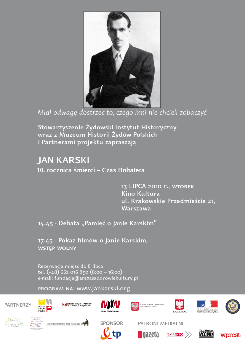 Stowarzyszenie Żydowski Instytut Historyczny wraz z Muzeum Historii Żydów Polskich i Partnerami projektu zapraszają do udziału w panelu poświęconym pamięci Jana Karskiego w 10. rocznicę jego śmierci, który odbędzie się we wtorek 13 lipca w Warszawie.